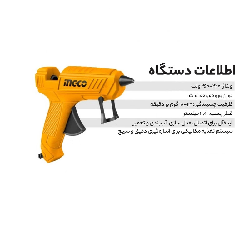 تفنگ چسب حرارتی 100 وات اینکو مدل GG148، برای چسباندن قطعات پلاستیکی، چوبی،مقوا و کاغذ به کار می آید همراه این دستگاه 4 عدد چسب فشنگی 11.2 × 100 میلی متری در بسته بندی قرار دارد که در خشاب پشت دستگاه قرار می گیرد.هیتر یا گرمکن دستگاه یک قطعه ی آلومینیومی است که در قسمت لوله قرار گرفته و با قدرت 100 وات چسب فشنگی را ذوب می کند.