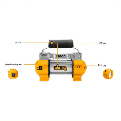 | سایر توضیحات | فناوری کمپرسور به صورت دوسیلندری تامین انرژی از طریق برق 12 ولت باتری خودرو با خروجی هوای 45 لیتر در دقیقه حداکثر فشار : 120PSI جریان برق : 18 آمپر همراه با 4 عدد نازل و شلنگ هوا و و فشارسنج به همراه کیف برزنتی با کیفیت دارای بدنهی با کیفیت، زیبا و ارگونومیک با عملکرد خوب و کارایی بالا مجهز به دستهی حمل با روکش اسفنجی نرم بادوام دارای چراغ LED برای کاربری به عنوان چراغ قوه مناسب برای باد کردن انواع لاستیک خودروهای سواری، دوچرخه و موتور سیکلت، توپ، اسباب بازی و ... به وزن 2380 گرم ابعاد : 25 × 21× 10 سانتی متر وزن بسته بندی : 3200 گرم ابعاد بسته بندی : 28 × 21× 20 سانتی متر به ابعاد 25 × 22× 10 سانتی متر ساخت کشور چین تحت لیسانس آمریکا مطابق با استاندارد CE اروپا دارای کد ثبت اختراع برای شرکت اینکو |