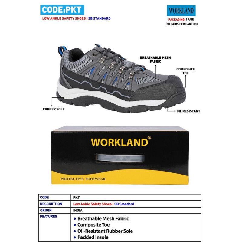 این مدل کفش متعلق به برند WORKLAND تولید شده در کشور هند می باشد .کفش در بخش رویه و زیره دارای کیفیت بسیار بالایی می باشد . طراحی آن بسیار اسپرت و ظریف بوده و اصلا در نگاه اول کفش ایمنی بنظر نمی رسد . جنس رویه آن ترکیب از چرم و لایه مش مشبک است که موجب شده کفش دارای تنفس پذیری مناسبی می باشد . سرپنجه این کفش از جنس کامپوزیت است . زیره کفش از جنس لاستیک و آنتی شوک ( SHOCK ABSORPTION جاذب ضربه ) و ضد لغزش و همچنین مقاوم در برابر روغن و مشتقات نفتی می باشد . وزن هر لنگه این کفش ( سایز 43) 500گرم بوده و سبک است . این کفش FREE METAL بوده و می توان عایق برق تا 220 ولت باشد .سایز این مدل کفش استاندارد است . بعنوان مثال اندازه کفی قرار گرفته داخل کفش در سایز 43 ( 27.5 سانتیمتر ) می باشد .