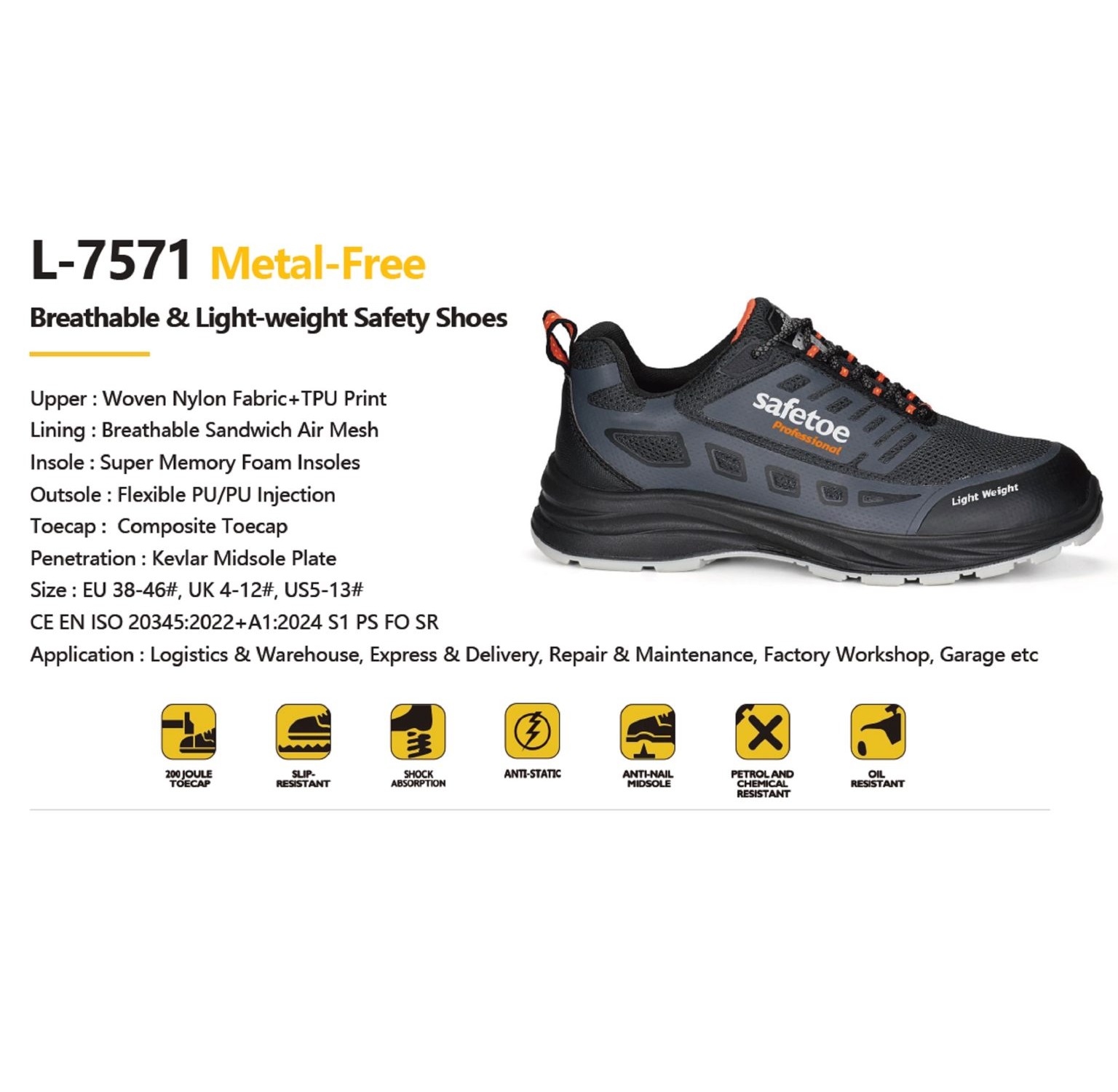 این کفش بسیار زیبا و اسپرت ساخت برند SAFETOE می باشد . جنس رویه کفش از مش بافت با تکنولوژی پرینت 3 بعدی با کیفیت بسیار بالا و فرآوری شده با فناوری تنفسی برای خشک نگه داشتن پا در تمام طول روز.می باشد . جنس استر از مش با تنفس بالای هوا تهیه شده است .در کف کفش از کفی های فوم مموری جذب شوک (ضربه گیر) فوق العاده راحت، برای کار 24 ساعته باآرامش و بدون خستگی کامل.استفاده شده است . جنس زیره از PU دو دانسیته است و در صفحه وسطی کفش از صفحه غیرفلزی (KEVLAR) انعطاف پذیر استفاده شده است . همچنین زیره آن سخت و مقاوم در برابر سایش است و طراحی کانال های در زیره جهت مقاومت در برابر لغزش برای جریان آب و روغن می باشد . جنس گلاهک سرپنجه از کامپوزیت با قابلیت تحمل 200 ژول ضربه می باشد . استانداردهای بکار گرفته شده در این کفش ( CE EN ISO 20345:2022 S1 PS FO SR (Metal-Free) ) می باشد .این کفش استاندارد تست آنتی استاتیک 100KΩ-1000MΩ، ولتاژ تست: 100±2 ولت DC، در دوره تست: 1 دقیقه گذرانده است . کفش FREE METAL بوده و عایق برق فشار ضعیف تا 380 ولت می باشد .از مهمترین ویژگی کفش LIGHT WEIGHT ( فوق سبک) آن می باشد که هر لنگه در سایز 43 ان حدود 500 گرم وزن دارد .