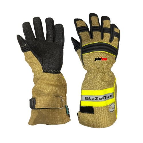 BlaZeOut PBI® X55 firefighter gloves by CanaSafe™ are EN659:2003 certified and built with high-performance materials for extreme protection. These lightweight gloves are flame, heat, water, cut, and puncture resistant, featuring a breathable inner layer, Dentik® ePTFE membrane, and extended wristlet for full wrist coverage.