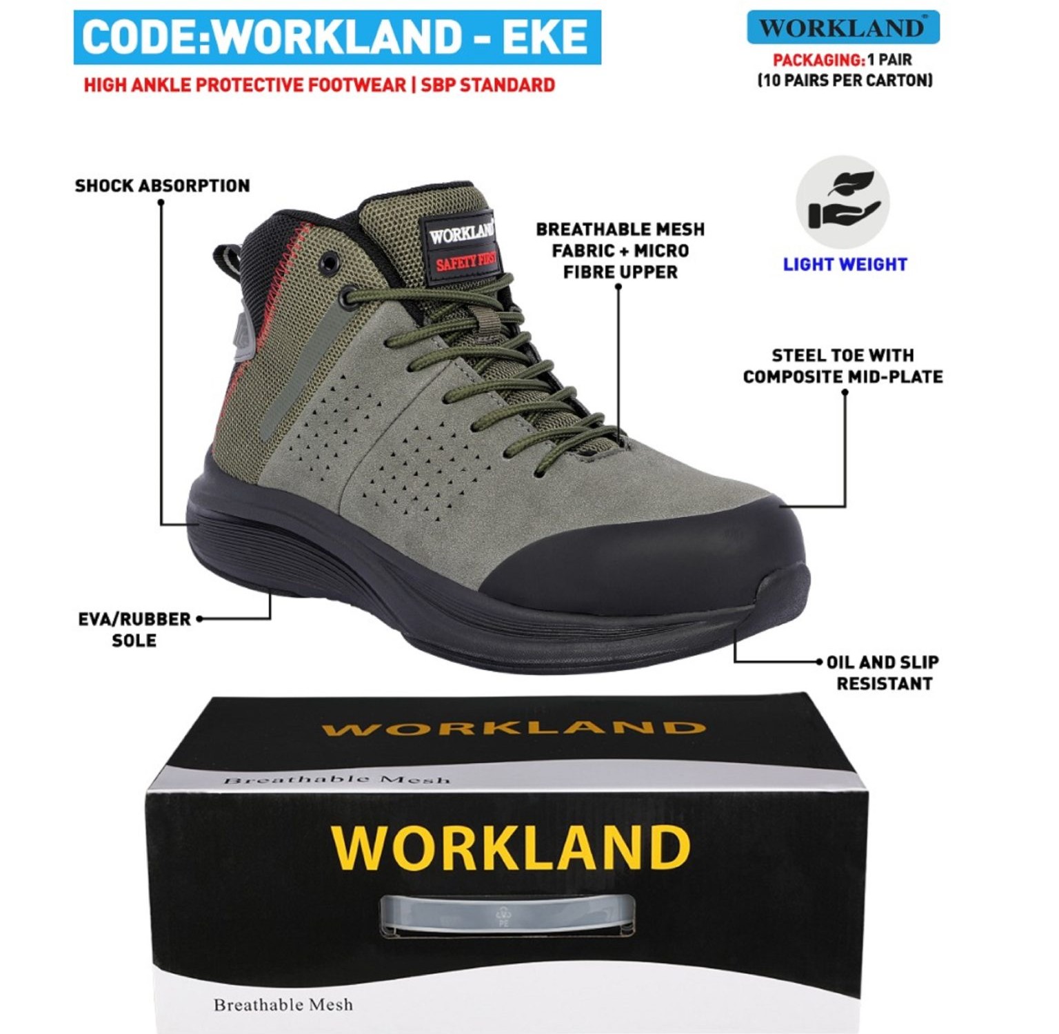 این مدل کفش متعلق به برند WORKLAND تولید شده در کشور چین می باشد .کفش در بخش رویه و زیره دارای کیفیت مطلوبی است . طراحی آن بسیار اسپرت و ظریف بوده و اصلا در نگاه اول کفش ایمنی بنظر نمی رسد . جنس رویه آن از میکروفایبر می باشد جنس سرپنجه از استیل مقاوم در برابر 200 ژول ضربه و فشار می باشد و لایه میانی نفوذناپذیر در زیره این کفش از جنس کامپوزیت است . زیره کفش از جنس EVA/RUBBER و آنتی شوک ( SHOCK ABSORPTION جاذب ضربه ) و ضد لغزش و همچنین مقاوم در برابر روغن و مشتقات نفتی می باشد . وزن هر لنگه این کفش ( سایز 43) 450 گرم است .